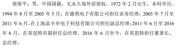 英思特原为在新三板挂牌的公司,后于2019年9月终止挂牌。根据该公司在2016年10月发布的《公开转让说明书》披露,实际控制人、董事长周保平此前于2004年6月至2011年6月在上海晶丰申电子科技有限公司担任副总经理,2011年7月开始担任英思特的总经理。但是在本次该公司IPO披露的招股书中则披露,周保平此前于2005年7月至2011年6月在上海晶丰申电子科技有限公司担任副总经理,2011年6月开始担任英思特的总经理。两次公开信息披露对于周保平供职于上海晶丰申电子科技有限公司的时间存在较大差异。