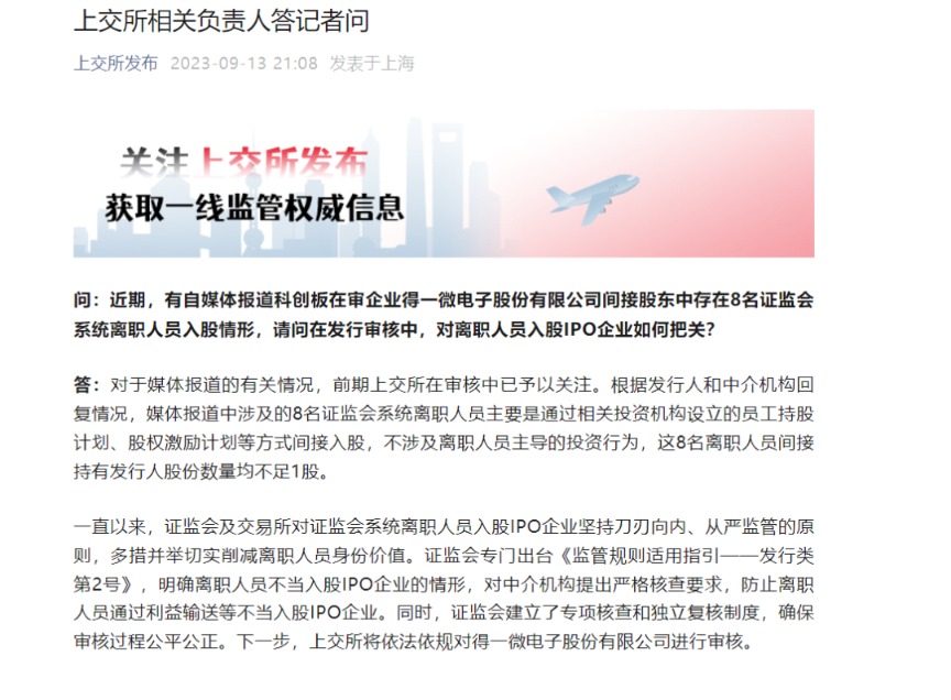 针对科创板在审企业得一微电子股份有限公司(以下简称:得一微)间接股东中存在8名证监会系统离职人员入股情形,上交所9月13日晚以答记者问的形式予以回应。