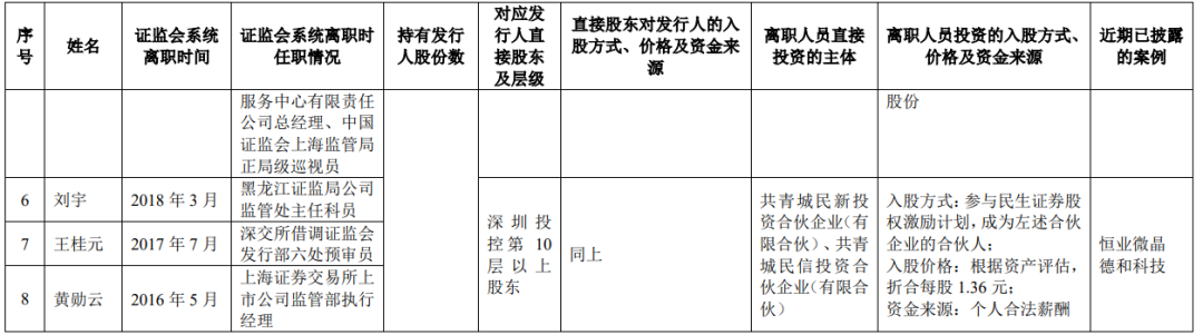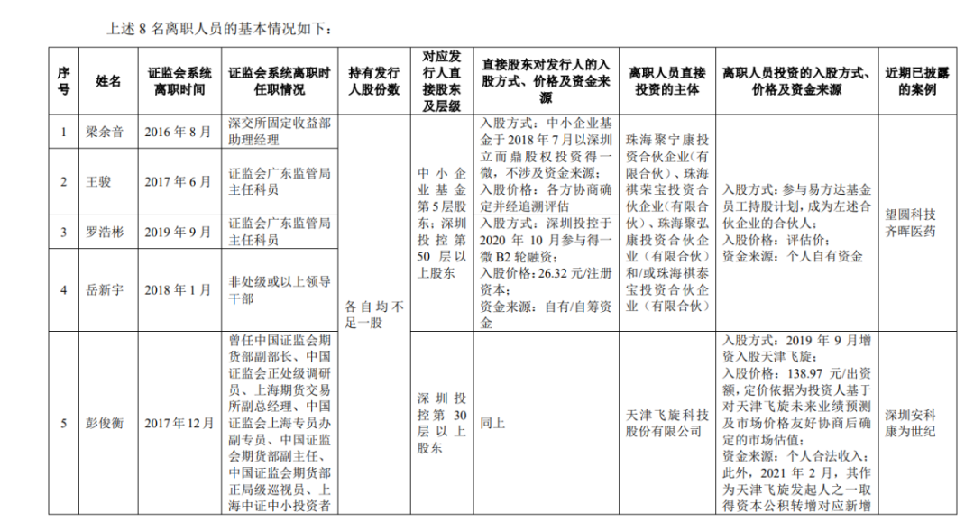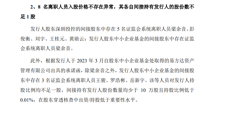 当时,发行人及保荐机构回复称,8名证监会系统离职人员对发行人持股比例均不足1股,间接持有发行人股份数量均少于10万股且持股比例低于0.01%,在股东穿透核查中出资/持股低于重要性水平。