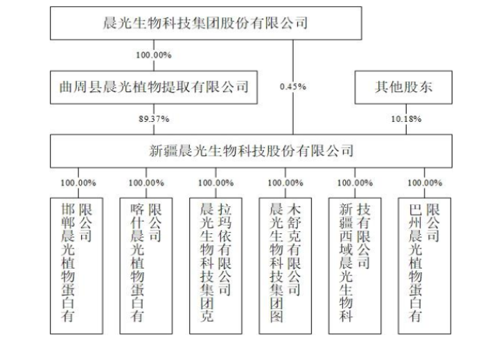截至招股书签署日,曲周植物提取直接持有公司89.37%的股份,为公司控股股东。曲周植物提取为晨光生物(300138.SZ)的全资子公司,且晨光生物直接持有新疆晨光0.45%股份;因此晨光生物通过直接和间接方式合计持有公司89.82%的股份。