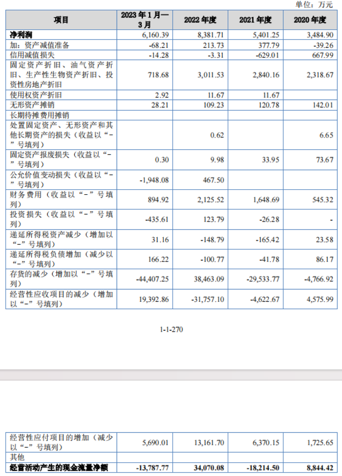 报告期内,公司经营活动产生的现金流量净额分别为8844.42万元、-1.82亿元、3.41亿元和-1.38亿元,净利润分别为3484.90万元、5401.25万元、8381.71万元和6160.39万元。可以看出,2021年和2023年一季度存在经营活动产生的现金流量净额为负的情况