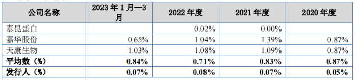 2020年-2023年一季度,公司研发费用率分别为0.05%、0.07%、0.08%和0.07%。农产品加工行业特点导致研发费用占营业收入比例整体较低,报告期内同行业可比公司平均值均不超过1%,但新疆晨光研发费用率甚至不足0.1%
