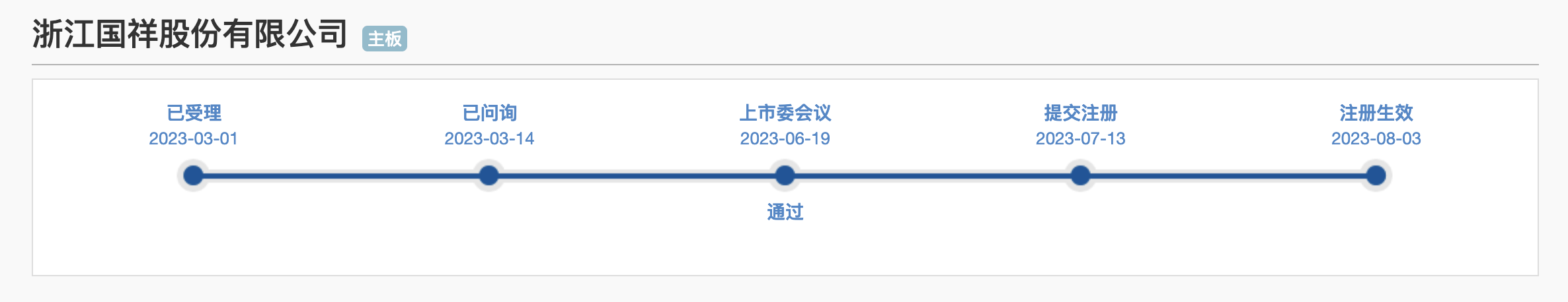 而后,浙江国祥再度将目标瞄向主板市场。2021年12月,浙江国祥二次向沪市主板递交了IPO申请,保荐机构依旧为东方证券。全面注册制后,2023年3月1日,浙江国祥主板IPO申请平移获受理,2023年6月19日上会通过,7月13日递交注册,8月3日注册生效,并原计划于10月9日开启申购。