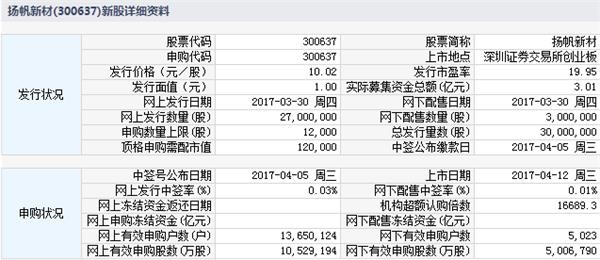根据交易所公告,浙江扬帆新材料股份有限公司于2017年4月12日起在深圳证券交易所创业板上市。
