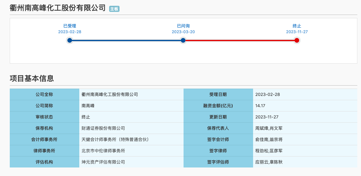 11月27日,上交所官网信息显示,因衢州南高峰化工股份有限公司(简称“南高峰”)及保荐机构撤回IPO申请,上交所决定终止对南高峰首次公开发行股票并在沪市主板上市审核。