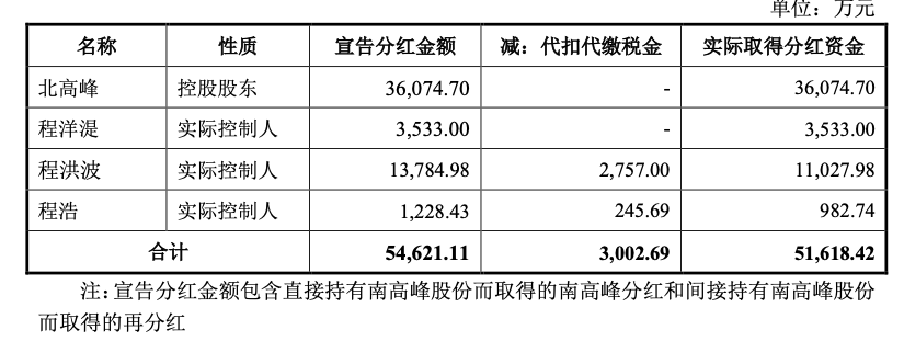 根据问询答复,2019年至2021年以及2022年前6月(简称“报告期”)与报告期前期,南高峰控股股东北高峰及实际控制人程洋湜、程洪波、程浩曾多次分红,宣告分红金额高达5.46亿元。其中,北高峰宣告分红金额为3.61亿元、程洪波宣告分红金额为1.38亿元、程洋湜宣告分红金额为3533万元、程浩宣告分红金额为1228.43万元。