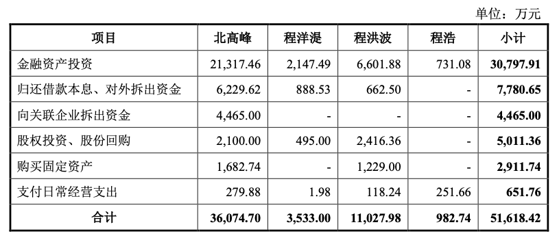 值得注意的是,南高峰大额分红最主要的流向是金融资产投资支出。问询答复数据显示,扣除税金后,南高峰控股股东北高峰及实际控制人程洋湜、程洪波、程浩实际取得分红资金为5.16亿元,其中七成以上资金,也就是3.80亿元流向以理财产品、股票证券等为主的金融资产投资,7780.65万元用以归还借款本息、对外拆出资金,4465.00万元用以向关联企业拆出资金,5011.36万元用以股权投资、股份回购等股权投资支出等,2911.74万元则用以购买固定资产,余下651.76万元则用以支付日常经营支出。