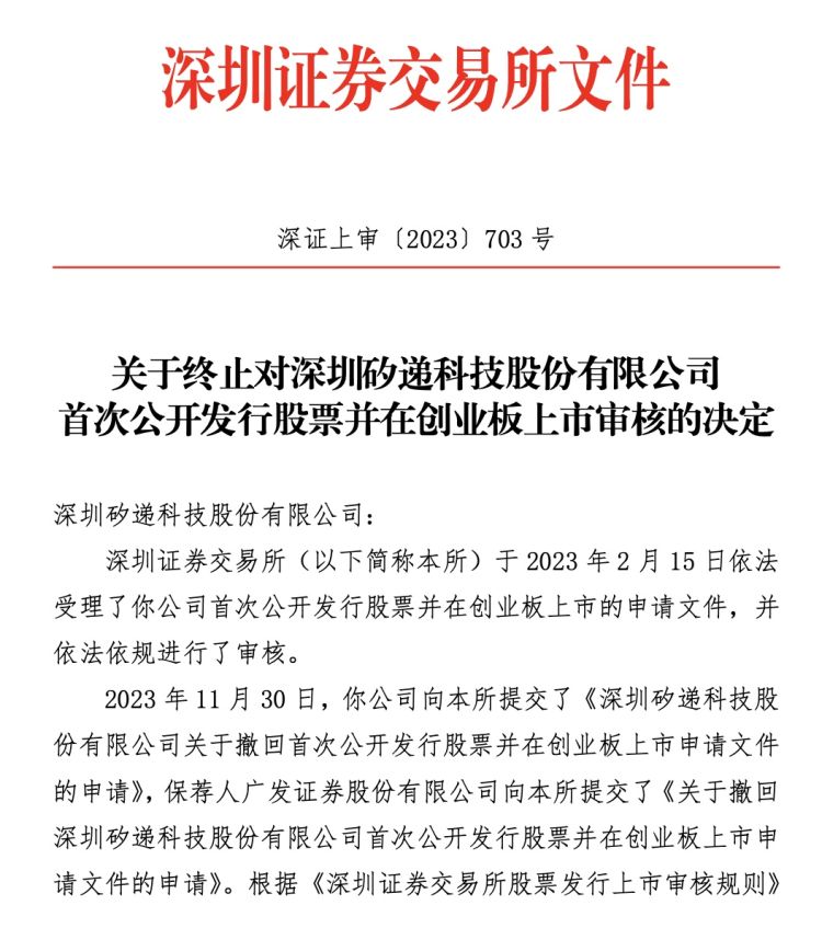 据深交所上市委12月6日公告,矽递科技11月30日向深交所提交了撤回上市申请文件的申请,根据规定,深交所决定终止对矽递科技首次公开发行股票并在创业板上市的审核。