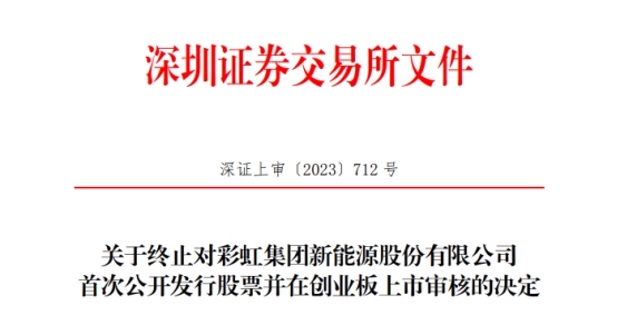 2023年12月11日,彩虹新能向深交所提交了《彩虹集团新能源股份有限公司关于撤回首次公开发行股票并在创业板上市申请文件的申请》,保荐人国泰君安证券股份有限公司向深交所提交了《关于撤回彩虹集团新能源股份有限公司首次公开发行股票并在创业板上市申请文件的申请》。根据《深圳证券交易所股票发行上市审核规则》第六十二条的有关规定,深交所决定终止对彩虹新能首次公开发行股票并在创业板上市的审核。