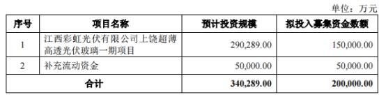 彩虹新能原拟在深交所创业板上市,公开发行新股数量不超过58,780,000股,占发行后总股本的比例不低于25%。公司拟募集资金200,000.00万元,分别用于江西彩虹光伏有限公司上饶超薄高透光伏玻璃一期项目、补充流动资金。