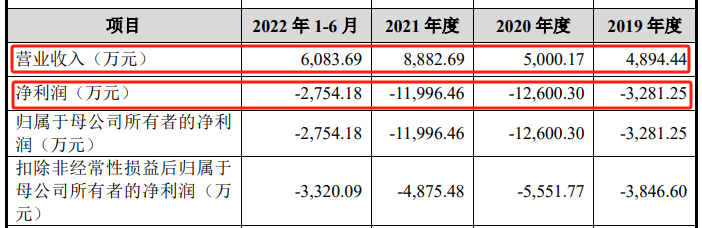 财务方面,公司报告期内(2019年到2021年,及2022年上半年)营业收入分别为4894万元、5000万元、8882万元和6083万元。公司净利润则处于持续亏损状态,分别录得-3281.25万元、-1.26亿元、-1.2亿元及-2754.18万元,累计亏损超3亿元。