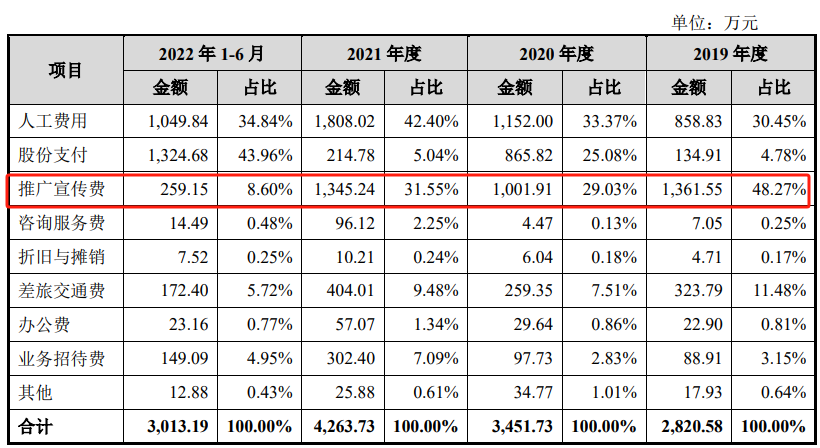 报告期各期,公司销售费用分别为2820.58万元、3451.73万元、4263.73万元及3013.19万元,占营业收入的比例分别为57.63%、69.03%、48%及49.53%。公司销售费用主要由人工费用、推广宣传费、股份支付费用、差旅交通费等构成,其中推广宣传费又占据销售费用大头,一度占比48%。