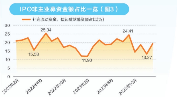 2023年10月以来,投向为“补充流动资金”或“偿还贷款”的计划募资金额占募资总额比例较2023年9月大幅下降,2023年12月仅有13.27%,较同年9月下降11个百分点以上。2024年1月的占比为19.27%,若不考虑艾罗能源(37.1%)、永兴股份(30%),1月“补充流动资金”等项目募资占比下降至16%左右(图3)。
