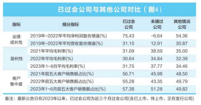 那么各类型IPO企业质量如何?为简化问题,数据宝仅考虑注册制实施以来,IPO审核状态最新公告日在2023年以来的公司,分别对比已过会公司(近三个月上市新股、已发行待上市和正在发行公司)、未通过公司(最新状态为终止注册、终止审查、IPO审核未通过)以及其他情况公司(审核状态为IPO审核待表决、IPO审核通过、已披露待审核公司),从业绩的成长性、盈利性,以及客户依赖度、研发等维度进行数据对比分析,发现IPO未通过公司的财务特征主要集中在以下3方面(图4):
