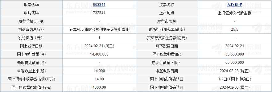 数据显示,龙旗科技的网上发行申购上限为14000股,顶格申购需配沪市市值14万元。龙旗科技拟发行新股6000万股,预计募资19.31亿元。