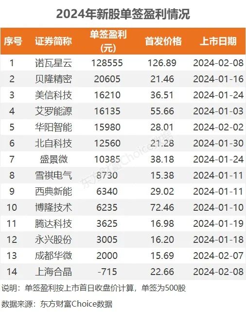 东方财富Choice数据显示,2024年以来,沪深A股首发上市的14只个股,按上市首日收盘价计算,有13股是赚钱的,除上述诺瓦星云外,贝隆精密美信科技艾罗能源、华阳智能、北自科技盛景微这6股,中一签也能赚超万元。而上海合晶为唯一亏损个股,中一签亏损715元。