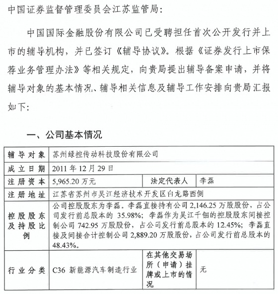 据备案报告,中金公司已受聘担任首次公开发行并上市的辅导机构,辅导对象绿控传动,成立于2011年12月29日,注册资本5965.2万元,公司控股股东李磊,李磊直接持股2146.25万股,占发行前总股本的35.98%;李磊作为吴江千钿的控股股东间接控制公司742.95万股,占发行前总股本的12.45%;李磊直接及间接持股2889.2万股,占发行前总股本的48.43%。根据辅导相关信息,这次拟定的律师事务所是北京德恒律师事务所,会计师事务所为容诚会计师事务所(特殊普通合伙)。