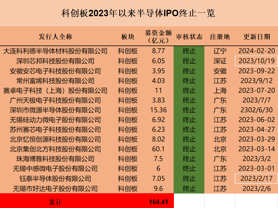 科创板是近几年半导体IPO的集中地,2023年上市的43家半导体公司中,38家来自科创板。记者进一步统计上交所IPO审核信息,2023年以来,科创板有15家半导体公司IPO终止,多数公司为主动撤回申请材料,包括安芯电子、赛卓电子、微源半导体、博雅科技、中感微、忆恒创源等,15家公司的拟募资金额合计为164.41亿元。有4家在“827新政”实施后终止,其中集创北方的拟募资金额最高,达60.1亿元,公司主要从事的显示芯片设计业务。