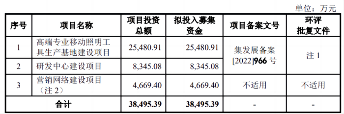 本次IPO公司拟募集资金2.6亿元,其中,1.84亿元用于高端专业移动照明工具生产基地建设项目,4600万元用于研发中心建设项目,3000万元用于补充流动资金。