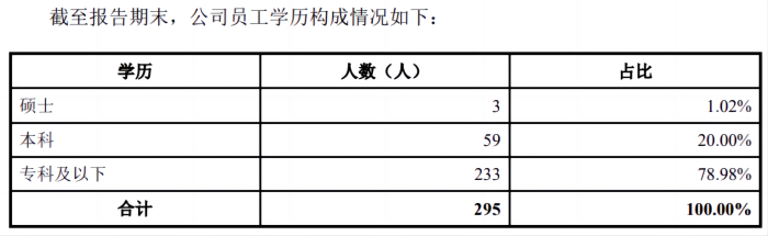 关于研发人员的学历情况,招股书中并没有具体披露,但界面新闻注意到,截至2023年9月末,公司员工总数为295人,其中只有3名员工为硕士学历,59名员工为本科学历,专科及以下的人数为233人。