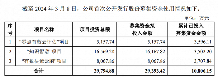 零点有数于2021年11月登录创业板,IPO募集资金总额3.50亿元,扣除发行费用约5600万元后,实际募集资金净额2.94亿元。该笔募集资金原计划投入三个项目,但两年多时间过去,投入进展缓慢,截至2024年3月8日,实际累计投入资金仅1.08亿元,实际投资金额占拟投资金额比重不足4成。