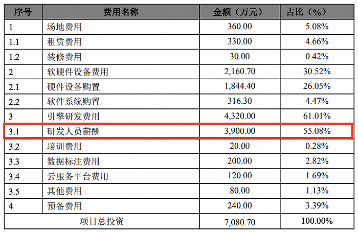 但从具体投资计划来看,项目研发人员薪酬及软硬件设备费用分别为3900万元、2160.70万元,占项目投资计划的比例分别高达55.08%、30.52%。