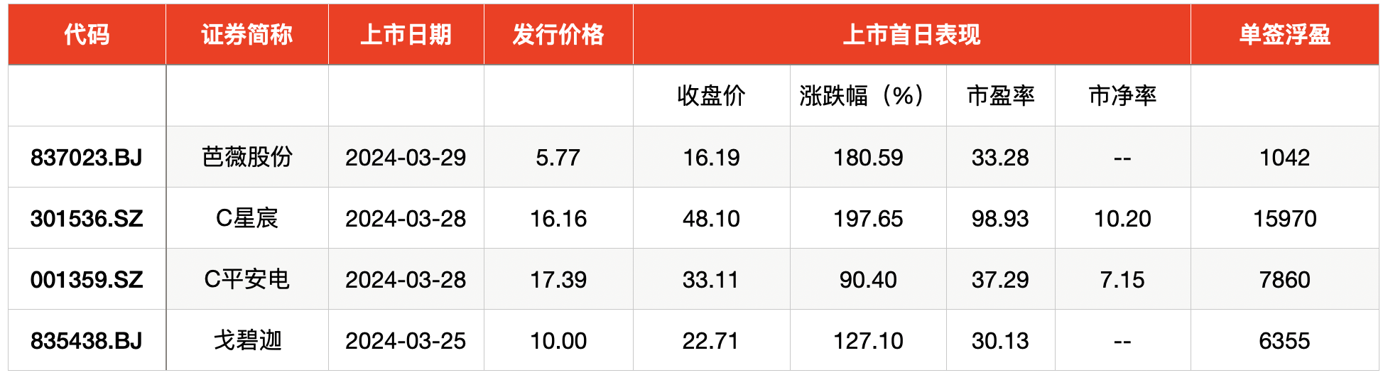 上周共有4只新股上市,为星宸科技股份有限公司(简称“星宸科技”,301536.SZ)、湖北戈碧迦光电科技股份有限公司(简称“戈碧迦”,835438.BJ)、湖北平安电工科技股份公司(简称“平安电工”,001359.SZ)、广东芭薇生物科技股份有限公司(简称“芭薇股份”,837023.BJ)。
