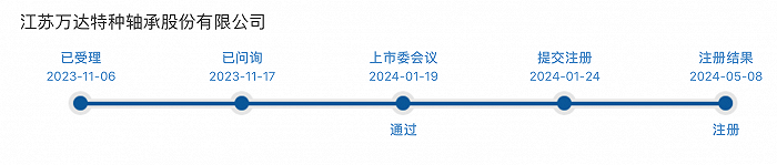 万达轴承在2023年1月12日于新三板挂牌,10个月左右的时间便进行申报,北交所的受理时间是2023年11月6日,2024年1月19日通过北交所上市委的审议,2024年1月24日提交注册,5月8日注册完成,5月10日批复落地。如今更是在5月21日进行申购,万达轴承可谓是“兵贵神速”。据悉万达轴承拟募1.037亿元。