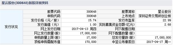 根据交易所公告,福建星云电子股份有限公司于2017年4月13日进行网上申购。本次发行新股数量为1,700万股,网上发行1,700万股,占本次发行总量的100%。本次发行股份全部为新股,不安排老股转让。