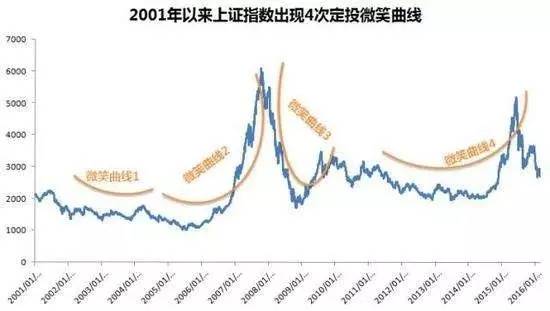 大家都知道低买高卖才能赚钱,但不是人人都懂什么时候才是低位,如果不小心被套在高位要怎么办?这就是基金定投要解决的问题,牛市进场没关系,随后的熊市就是拉低成本的最佳机会,只要坚持,下一个牛市就能解套甚至赚钱,原理其实很简单。从2001年到现在,股市一共经历了4个微笑曲线。