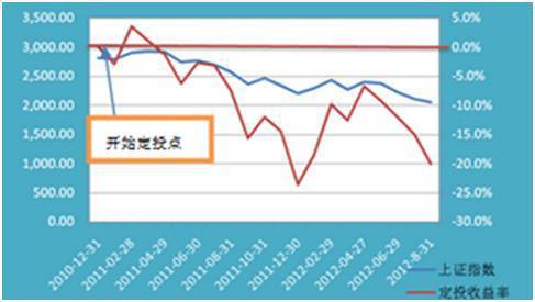 截止2012年8月31日,上证指数下跌了27.1%。除2011年3月、4月略有盈余外,近两年的定投都是亏损。
