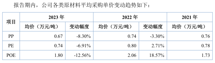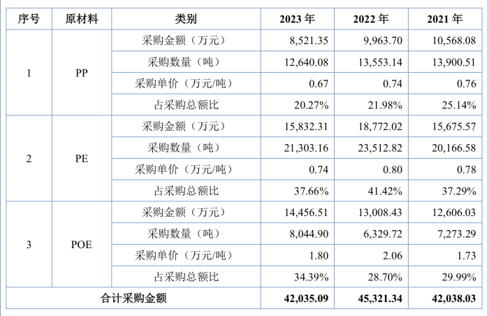 不过需要指出的是,能之光主要原材料为PP、PE、POE等,公司能源采购主要为电力和水。单这PP、PE、POE的采购额,合计就占到采购总额的89.03%,而PP、PE和POE等,会受到宏观经济周期、市场供需以及汇率波动等因素的影响,价格存在一定程度的波动,对公司的产品成本造成一定的影响。