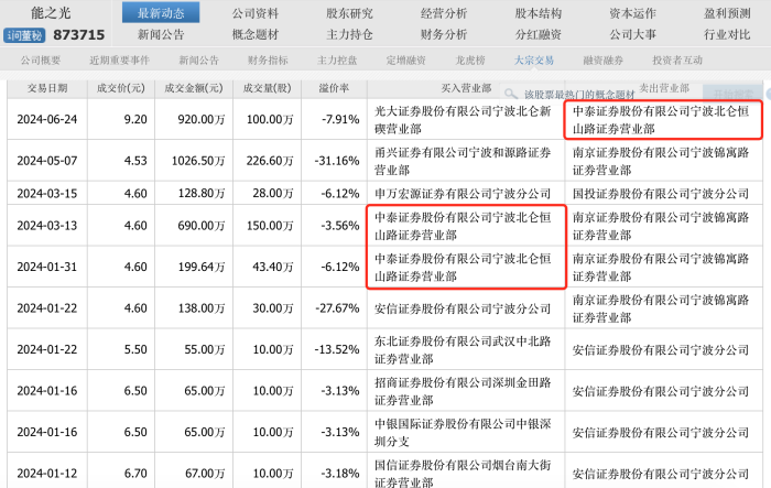 数据显示,6月24日,中泰证券宁波北仑恒山路营业部以9.2元的价格卖给光大证券宁波北仑新碶营业部100万股,成交金额达920万元。值得注意的是,能之光6月24日当天涨幅31.45%,从7.6元前收盘价冲到9.99元。