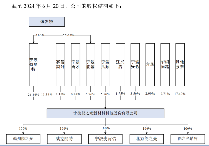 说明书显示,截至6月20日,能之光控股股东为宁波微丽特,实际控制人为张发饶。宁波微丽特持股26.46%,张发饶直接间接控制51.13%的表决权,且为公司的董事长。