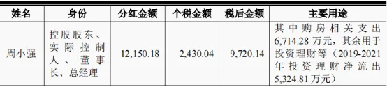 首先,该公司存在突击分红的行为。博实结是2022年5月19日提交IPO申请并获深交所受理的,然而,在2020年及2021年,均实施了各1亿元的现金分红,分红比例分别达到86.43%、51.52%。因此,该公司的分红明显有突击分红的性质。而该公司之所以突击分红,无非是为了将上市前公司的利润分配给老股东,尤其是控股股东、实控人周小强的手上。根据首轮审核问询函显示,周小强税后分红共9,720.14万元(税前分红12150.18万元),主要用于购房支出及投资理财。其中购房相关支出6714.28万元。很显然,企业要上市了,周小强的创业也就成功了,周小强本人也可以好好地享受享受了。只不过,周小强在自己享受的同时,又把手伸向了公众投资者的荷包。