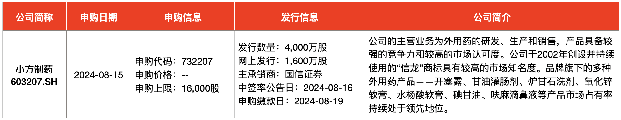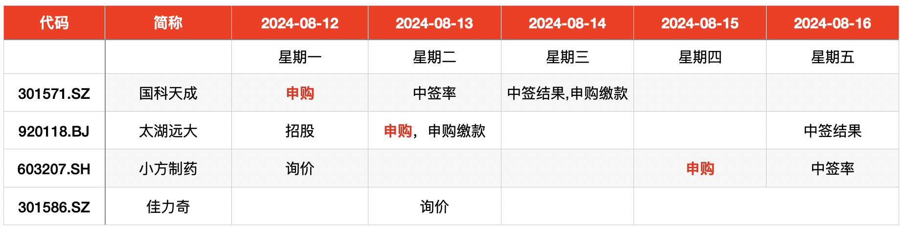 澎湃新闻根据Wind及公开信息梳理统计,本周(8月12日-8月16日)安排3只新股网上申购,暂无新股上市。其中,3只申购的新股分别为国科天成科技股份有限公司(简称“国科天成”,301571.SZ)、浙江太湖远大新材料股份有限公司(简称“太湖远大”,920118.BJ)、上海小方制药股份有限公司(简称“小方制药”,603207.SH)。