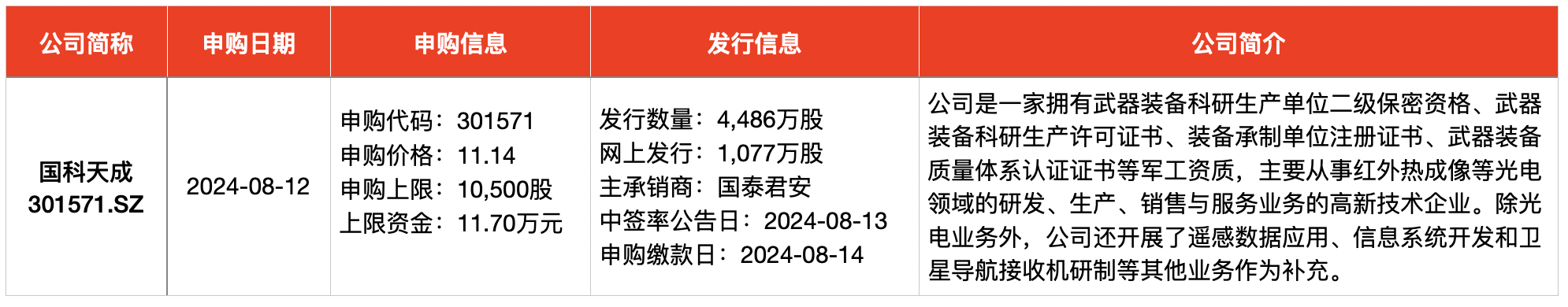 摘要:  本周将迎来“920第二股”申购。  澎湃新闻根据Wind及公开信息梳理统计,本周(8月12日-8月16日)安排3只新股网上申购,暂无新股上市。其中,3只申购的新股分别为国科天成科技股份有限公司(简...