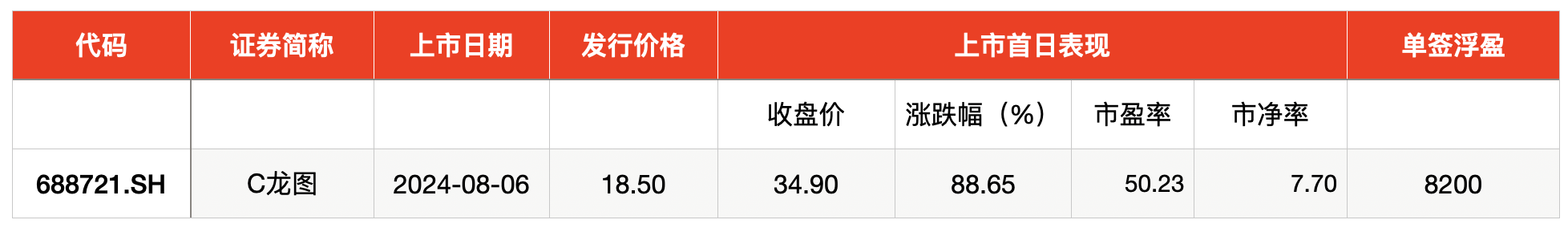 8月6日,龙图光罩在科创板上市,发行价格18.5元。上市首日,高开121.62%,随后涨幅回落,截至收盘报34.9元/股,涨幅88.65%。按收盘价计算,投资者中一签浮盈8200元。