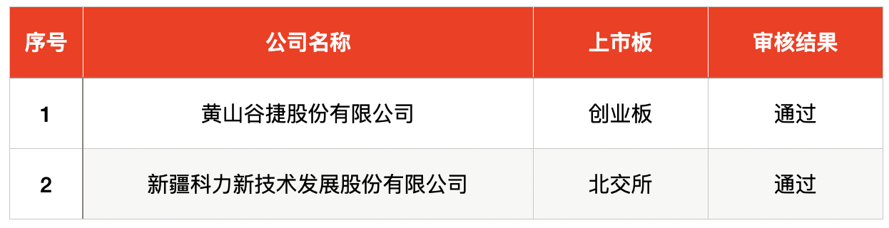发审委审核方面,上周,深交所与北交所各安排了一家公司上会,黄山谷捷股份有限公司(简称“黄山谷捷”)、新疆科力新技术发展股份有限公司(简称“科力股份”)均获得通过。