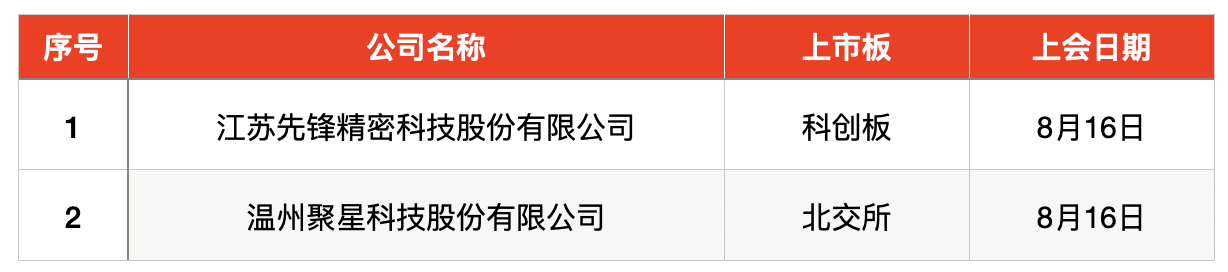 本周,上交所与北交所均发布了新的审议会议公告。深交所上市审核委员会定于8月16日召开2024年第20次上市审核委员会审议会议,审议的IPO发行人为江苏先锋精密科技股份有限公司。北交所上市委员会定于8月16日上午9时召开2024年第13次审议会议,审议的IPO发行人为温州聚星科技股份有限公司。