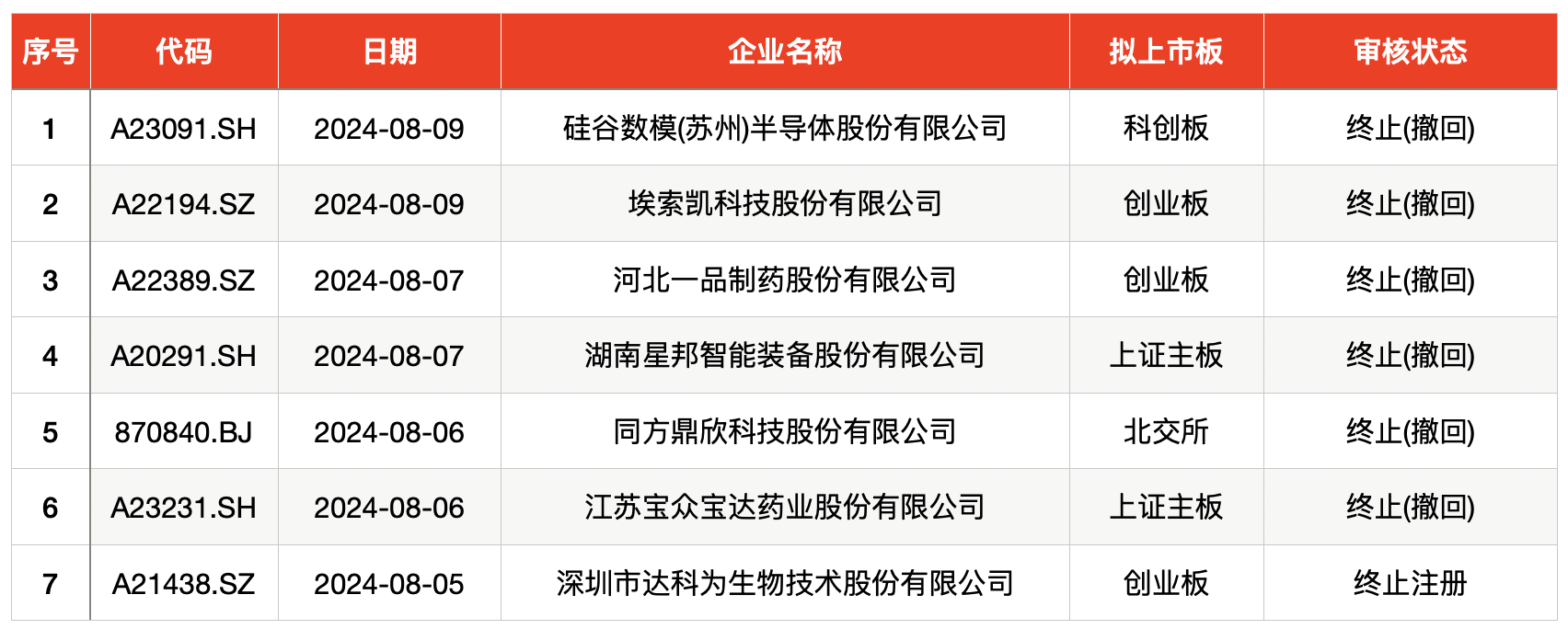 此外,上周,共有7家企业主动撤回IPO材料,分别为硅谷数模(苏州)半导体股份有限公司、埃索凯科技股份有限公司、河北一品制药股份有限公司、湖南星邦智能装备股份有限公司、同方鼎欣科技股份有限公司、江苏宝众宝达药业股份有限公司、深圳市达科为生物技术股份有限公司。