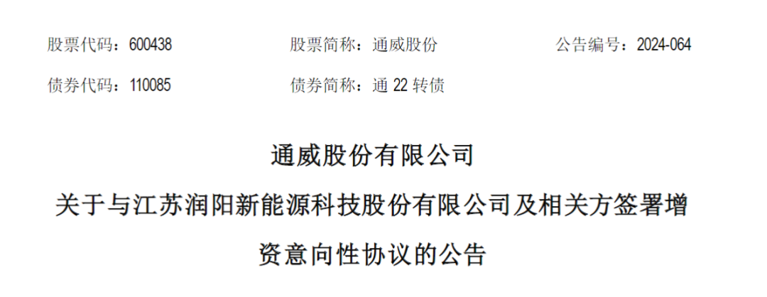 通威股份8月13日晚公告,公司拟与润阳股份、上海悦达新实业集团新能源有限公司等润阳股份相关股东、江苏悦达集团有限公司(简称“江苏悦达集团”)签订《增资意向协议》。协议签订后,由江苏悦达集团对润阳股份进行现金增资10亿元。在公司完成对润阳股份尽职调查以及审计、评估工作,并与各方达成正式增资具体方案后,将以自有或自筹资金向润阳股份现金增资,同时现金收购江苏悦达集团前述增资10亿元所取得的润阳股份股权。