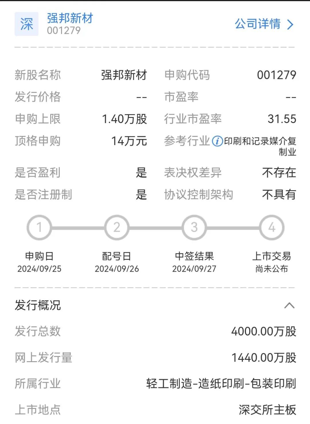 据悉,强邦新材拟公开发行股票总数为4000万股,其中网上发行申购上限为1.4万股,网上顶格申购需要配置深市市值为14万元。