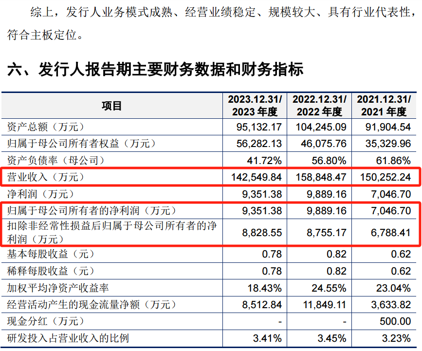 2021年至2023年,强邦新材的营业收入分别为15.03亿元、15.88亿元、14.25亿元,归母净利润分别为7046.70万元、9889.16万元、9351.38万元。