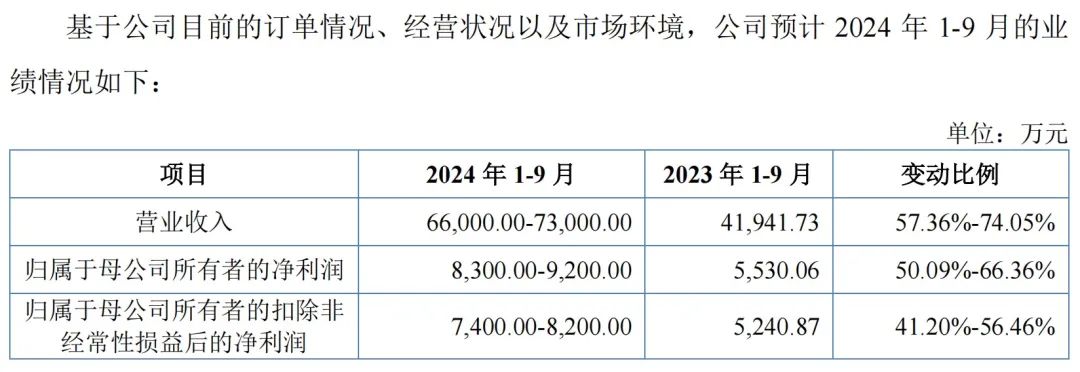 聚星科技招股书称,预计公司2024年前三季度实现净利润8300万元至9200万元,同比增长50.09%至66.36%。