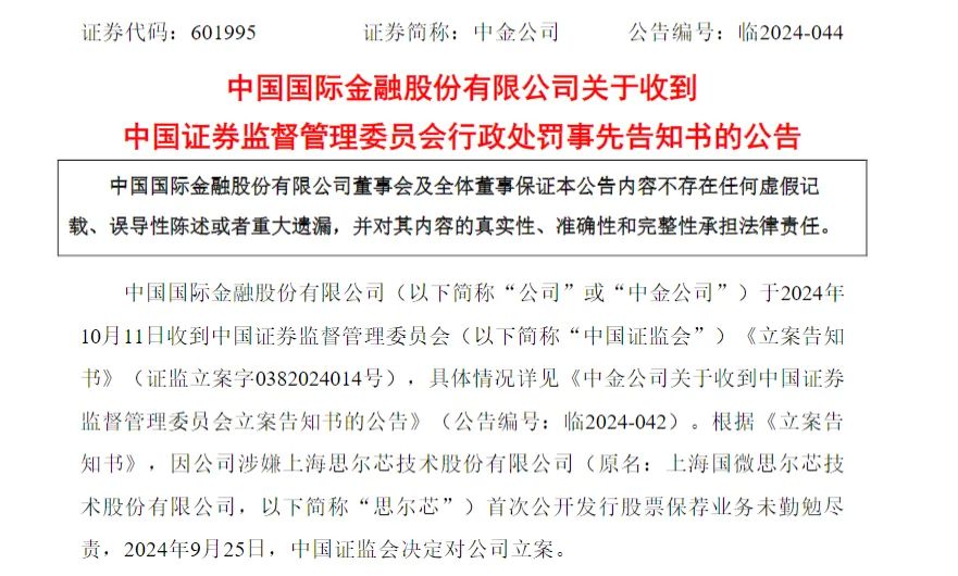 10月26日晚间,短短一个月的时间,中金公司再次发布公告称,收到证监会的《行政处罚事先告知书》,证监会对思尔芯一案已调查完毕。