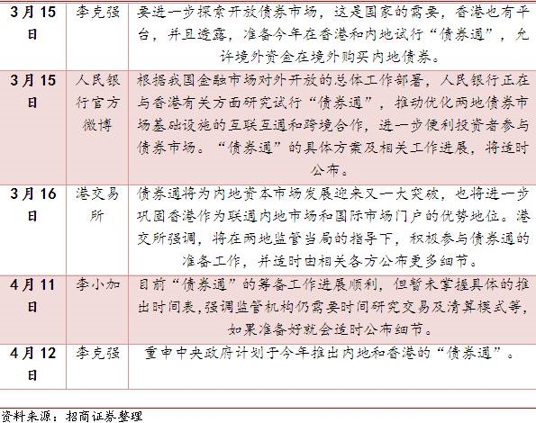 李总理于近期再次提及推出“债券通”。此前其在两会结束后会见中外记者时首次提及这一计划,并称将进一步探索开放债券市场,这也将有利于维护香港国际金融中心的地位。而近日有消息进一步指出,我国将最快于7月宣布中港“债券通”的详情,计划将采取“先北后南”的做法,境外投资者可通过OTC市场与港交所两个渠道进行买卖交易。核心观点:近来多位高层官员提及“债券通”事项,虽然相关细节目前仍未公布,但仍引起境内外投资者的广泛关注。在人民币汇率趋稳的时候推动“债券通”的落地,从细处看是进一步推进我国债券市场的开放,从更广的角度看则关乎人民币国际化的进一步深化。
