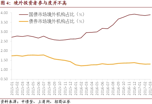另一个层面则涉及允许境外机构投资我国在岸人民币债券,这与“债券通”的开通有更加紧密的联系。目前境外机构在我国债券市场中的占比水平仍较低,自2016年2月份央行发布银行间债券市场开放的3号文以来(截至2017年3月份),境外机构累计增持人民币债券2154亿元,在中债登与上清所的托管总量达到7835亿元,增幅接近38%,但境外在国债市场中占比仅为3.90%,而在债券市场整体中占比更是仅为1.30%,境外投资者参与度并不高。