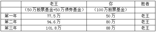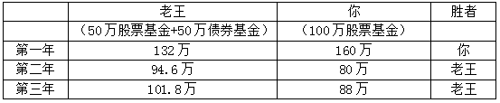 假设你和隔壁老王各有100万。老王买了50万的股票基金和50万的债券基金,你觉得股市这么好,把100万全买了股票基金。我们来看看,3年之后到底谁是赢家。