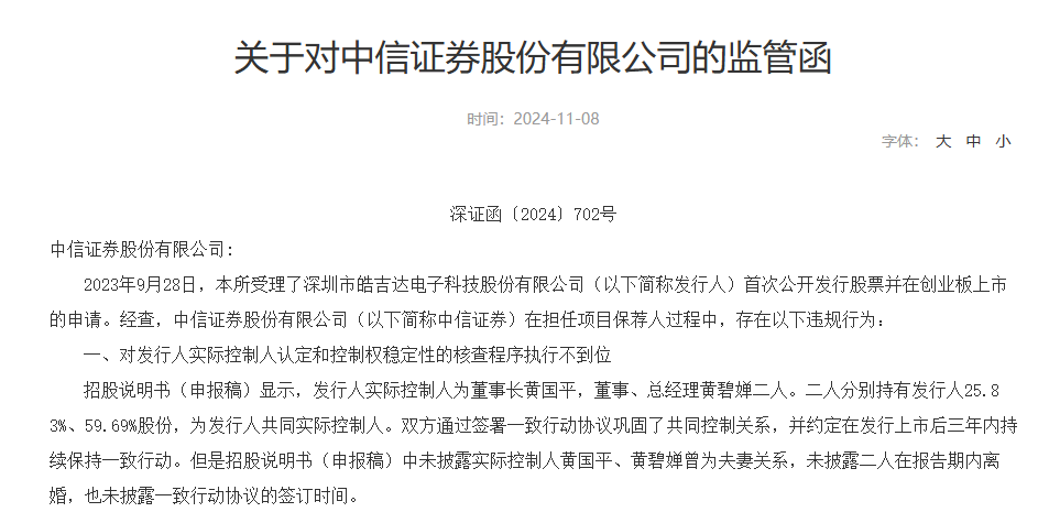 11月8日,深交所网站发布两则监管措施。因在保荐深圳市皓吉达电子科技股份有限公司过程中,涉及对发行人实际控制人认定和控制权稳定性的核查程序执行不到位等违规行为,中信证券被采取书面警示,两位保荐代表人被给予六个月不接受其签字的发行上市申请文件、信息披露文件的纪律处分。